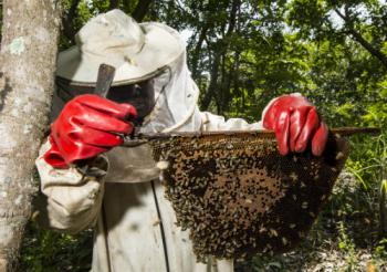 Um apicultor inspeciona seu honeycomb